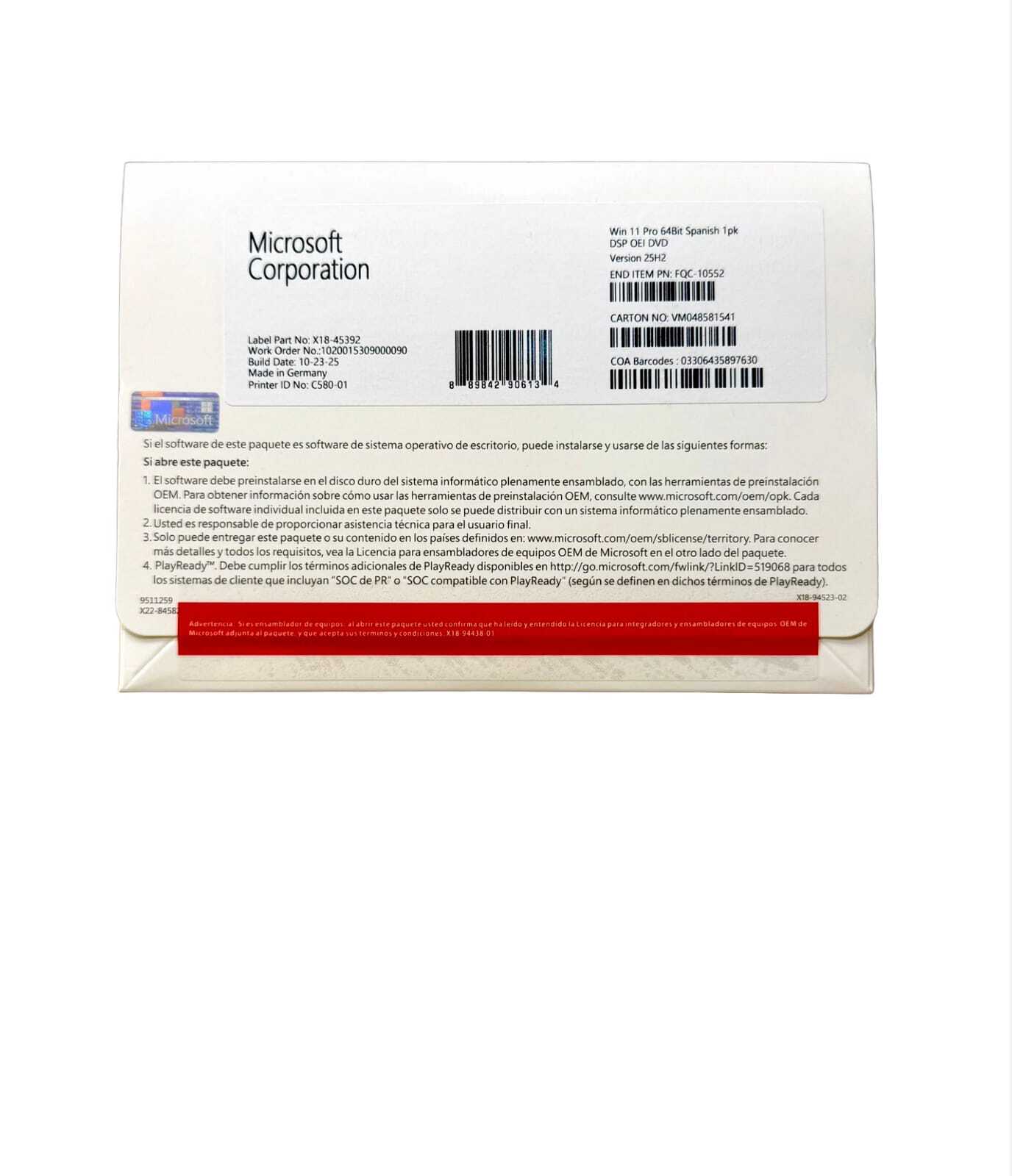 - Sistema Operativo Microsoft Windows 11 Pro 64bit Español DVD